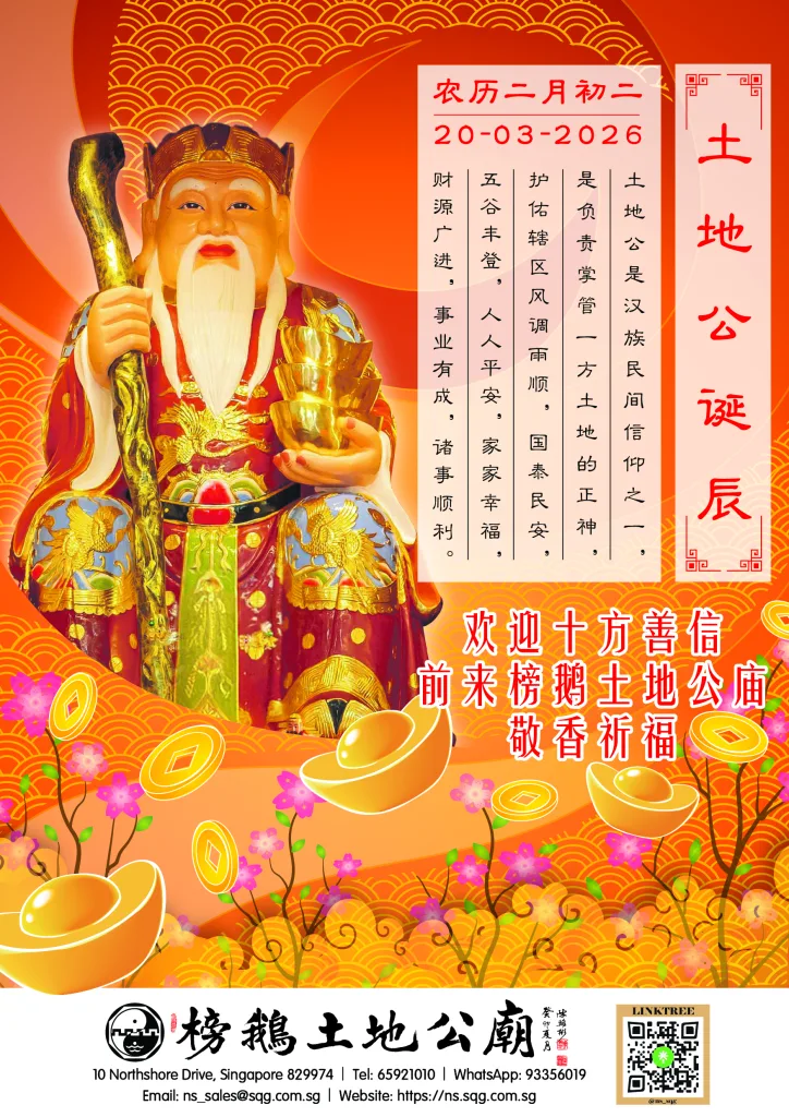 土地公信仰源远流长,起于中国古代对土地与自然的崇敬,并融合祖先信仰,历经时代发展,逐渐成为道教及民间信仰体系中极具代表性的护境神明。土地公主掌一方土地,护佑地方清宁、民生安稳,深受民间敬奉。在新加坡及东南亚地区,土地公信仰尤为普遍,华人庙宇多于农历二月初二举行土地公诞辰庆典,广邀善信前来拈香礼拜,同沾神恩。